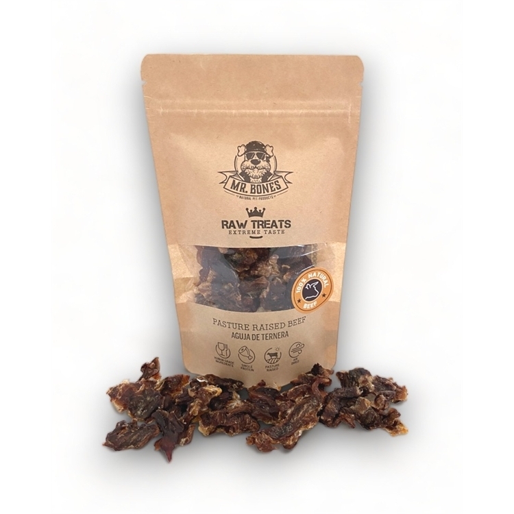 Vi har fundet Mr Bones Raw Treats Beef fra Mr. Bones hos Hunde-foder.dk i kategorien Godbidder. Naturlig og sund godbid af 100% oksekød, skåret i små stykker og nænsom tørret ved lavtemperaturluft.
