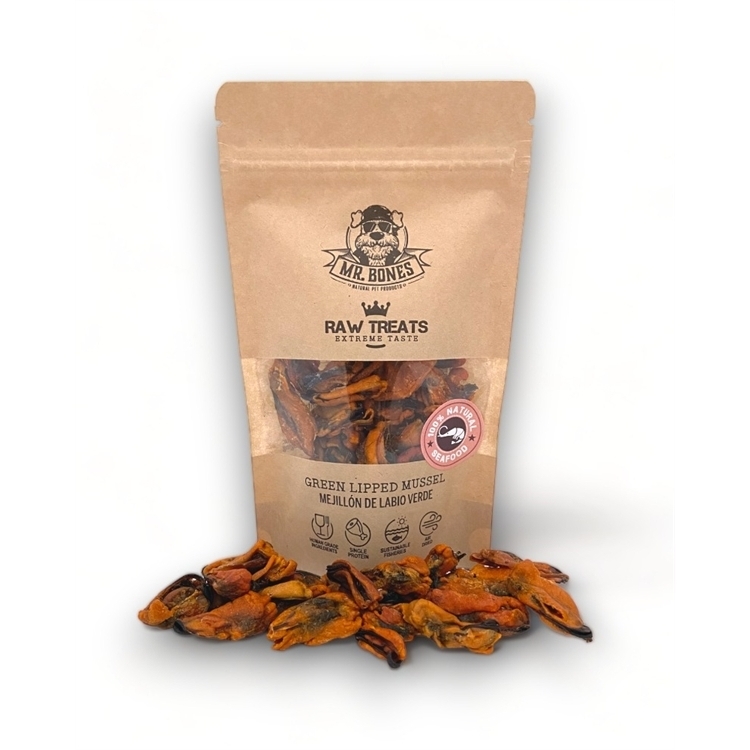 Vi har fundet Mr Bones Raw Treats Green-lipped Mussel fra Mr. Bones hos Hunde-foder.dk i kategorien Godbidder. Naturlig og sund godbid af 100% grønlæbet musling, skåret i små stykker og nænsom tørret ved lavtemperaturluft.